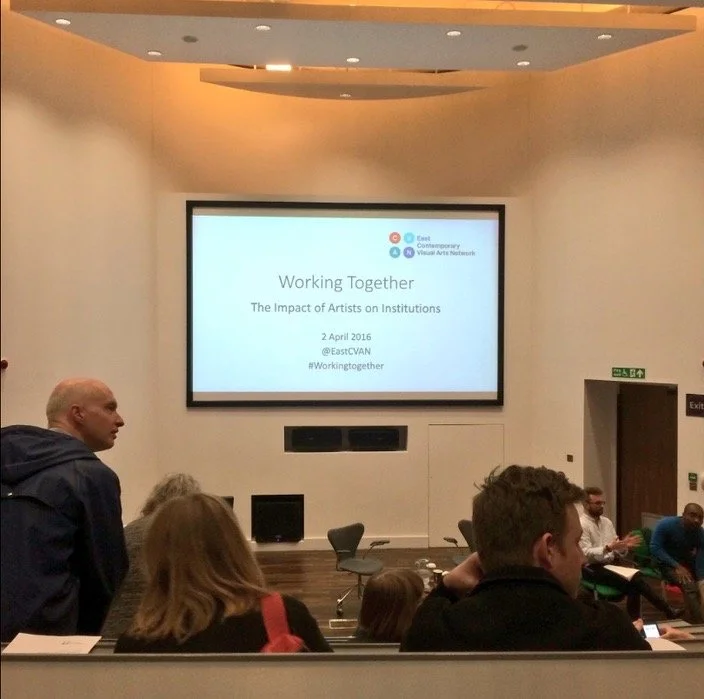 Yesterday I rolled out of bed earlier than traditionally acceptable on a Saturday for East CVAN’s ‘Working Together’ symposium. The symposium was billed as exploring the impact of artists on institutions. Held at my new local institution Focal Point Gallery, Southend on Sea. I came armed with a big cup of tea and a packet of lockets (you can’t find Fisherman’s Friends in Southend for love nor money).